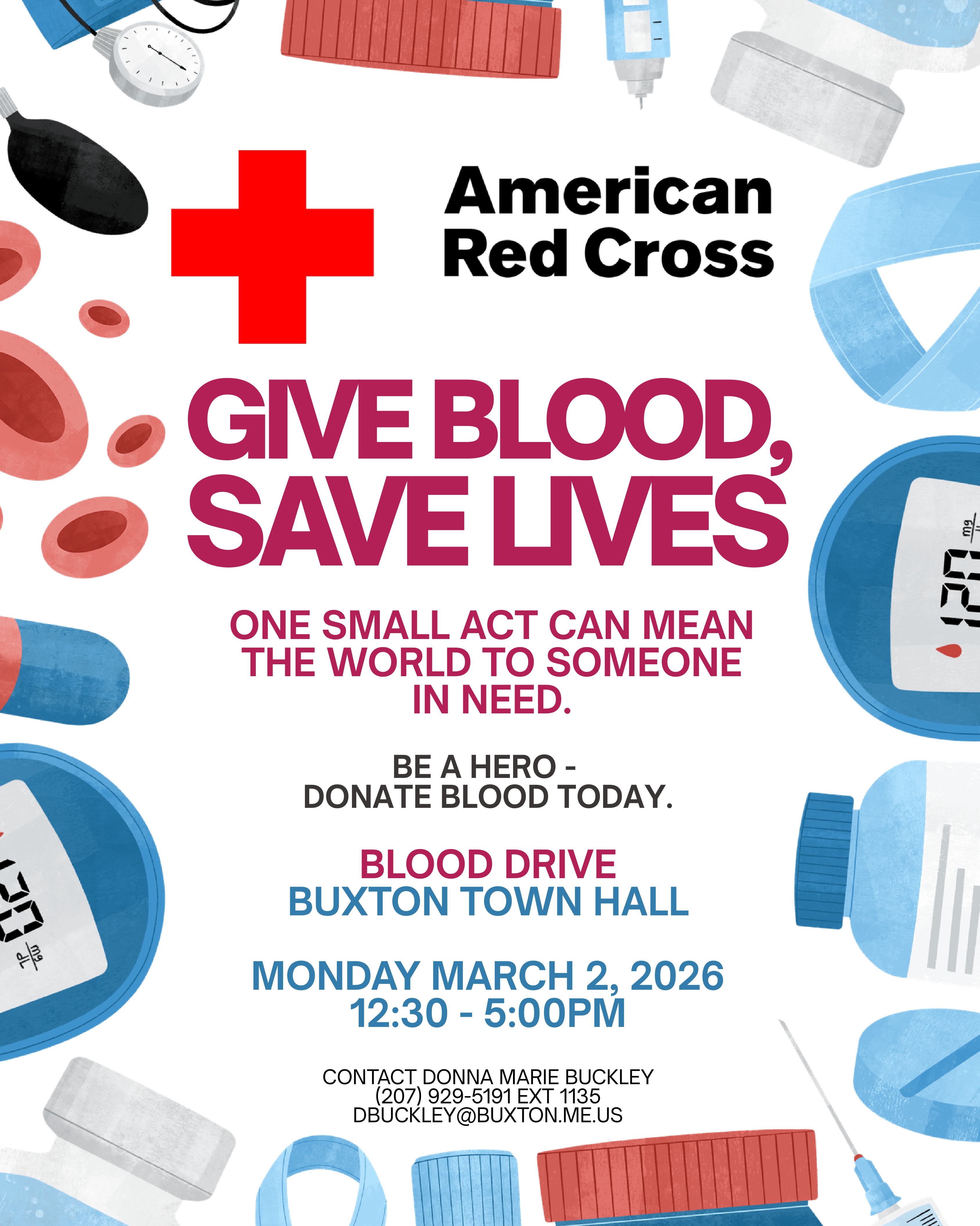 The American Red Cross will be having a blood drive at the Buxton Town Hall on Monday, March 2nd from 12:30 PM - 5 PM.