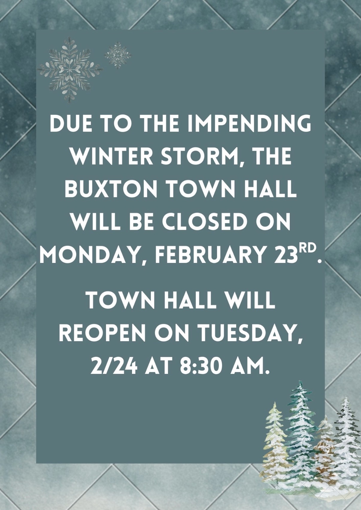 Due to the impending snow storm, the Buxton Town Hall will be closed on Monday, February 23rd.