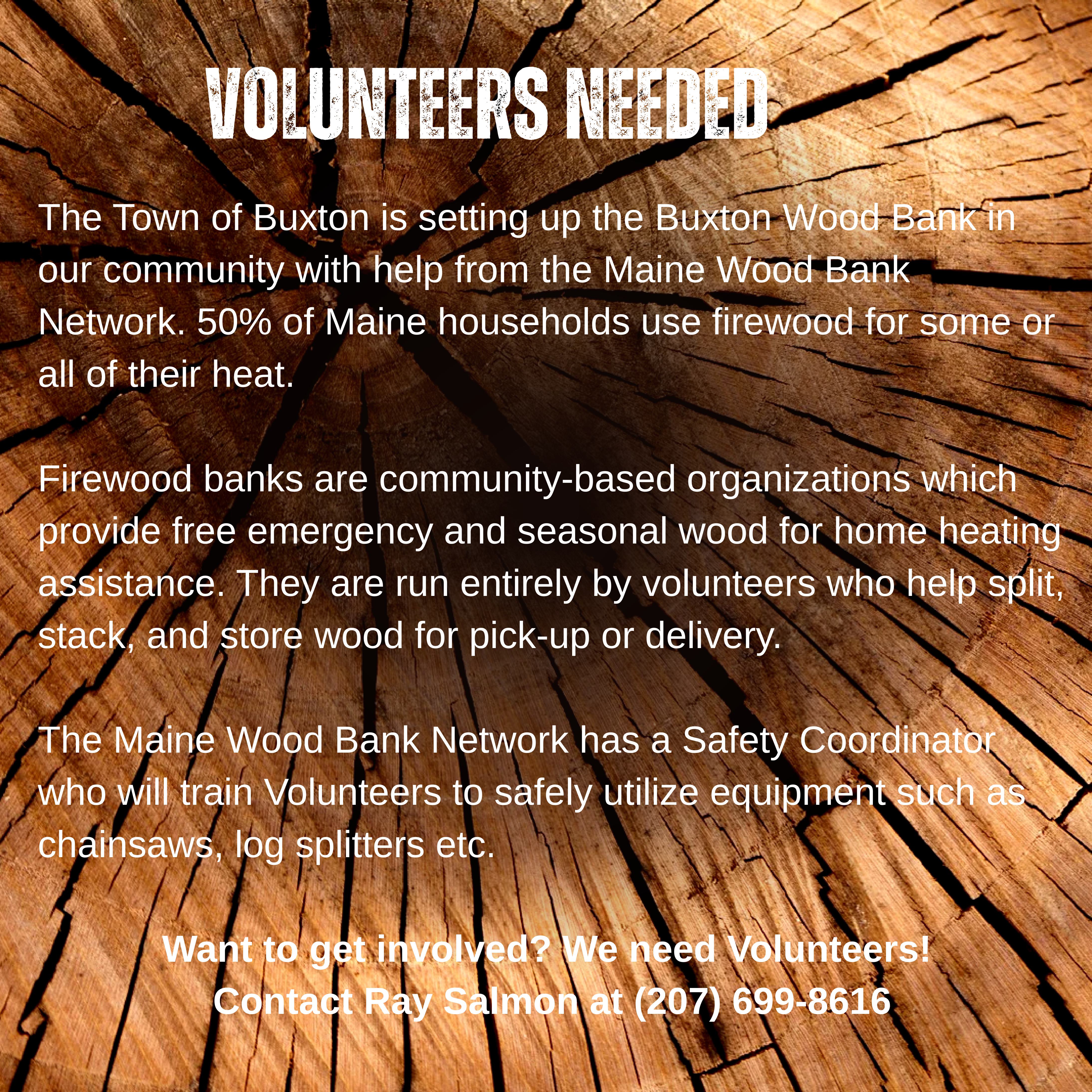 With help from the Maine Wood Bank Network, the Town of Buxton is setting up a Wood Bank in our community. 50% of Maine households use firewood for some or all of their heat.