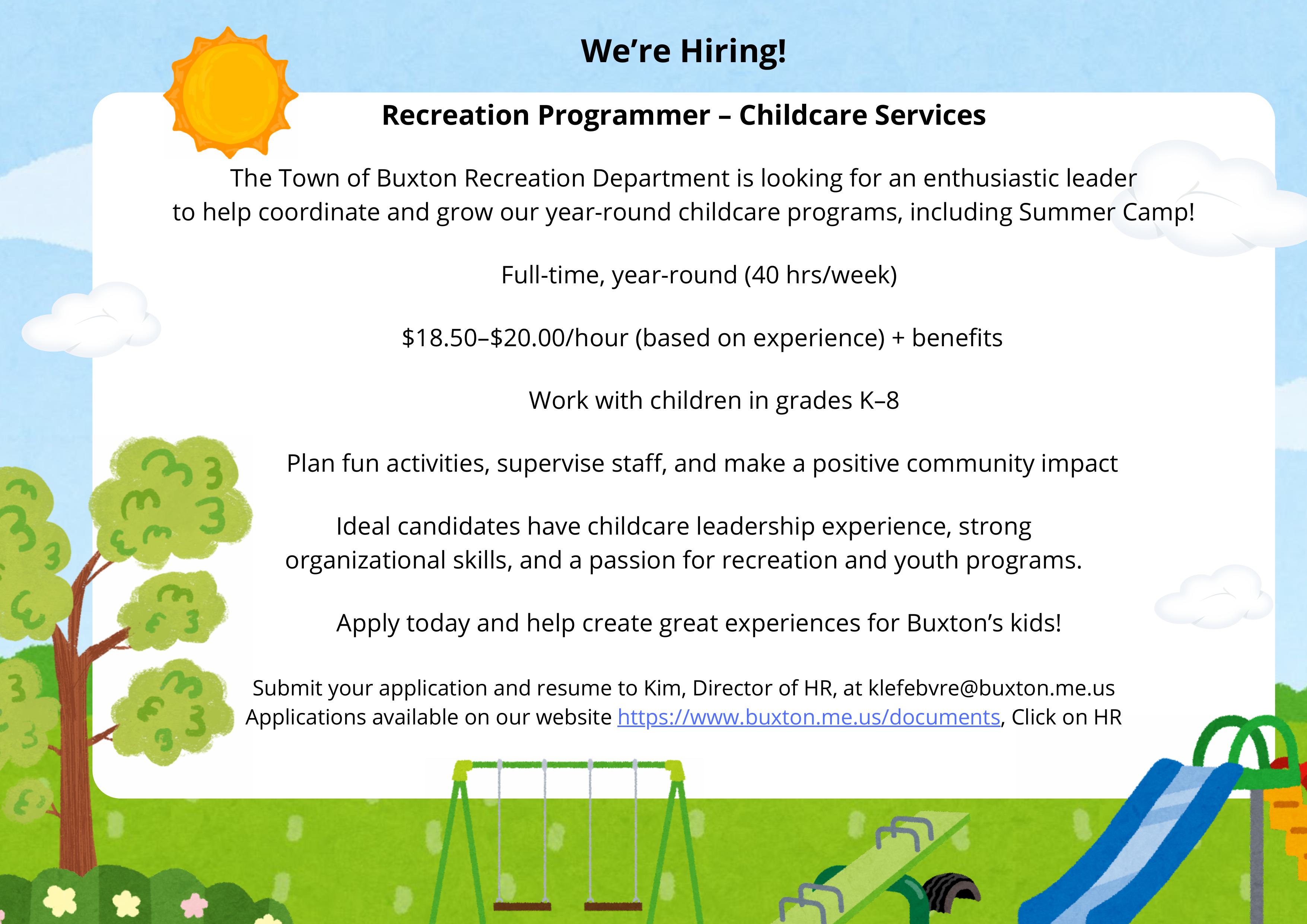 The Buxton Recreation Department is hiring a full-time Recreation Programmer.