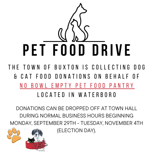 Last year, the Town of Buxton donated 991 POUNDS of dog and cat food plus other much-needed pet supplies to help our furry friends in York and Cumberland counties. We are hoping to donate over 1,000 pounds of food this year! Donations can be dropped off at Buxton Town Hall beginning Monday, September 29th. Donations will be accepted through Tuesday, November 4th (Election Day).