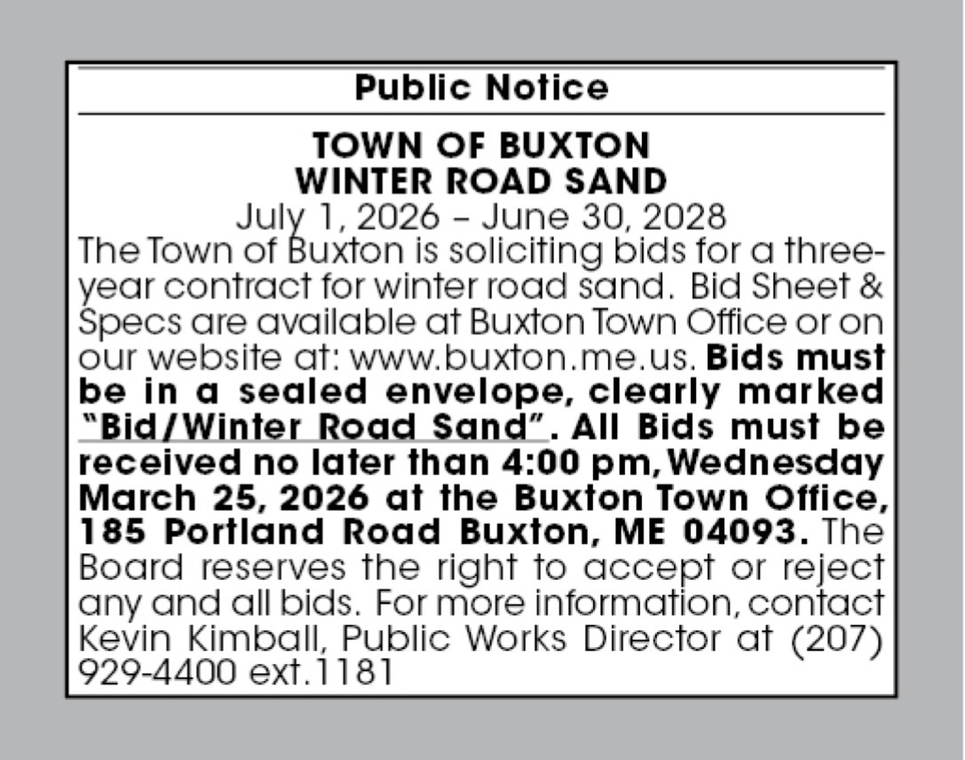 The Town of Buxton is soliciting bids for a three-year contract for winter road sand. Please see the attached documents for additional information.