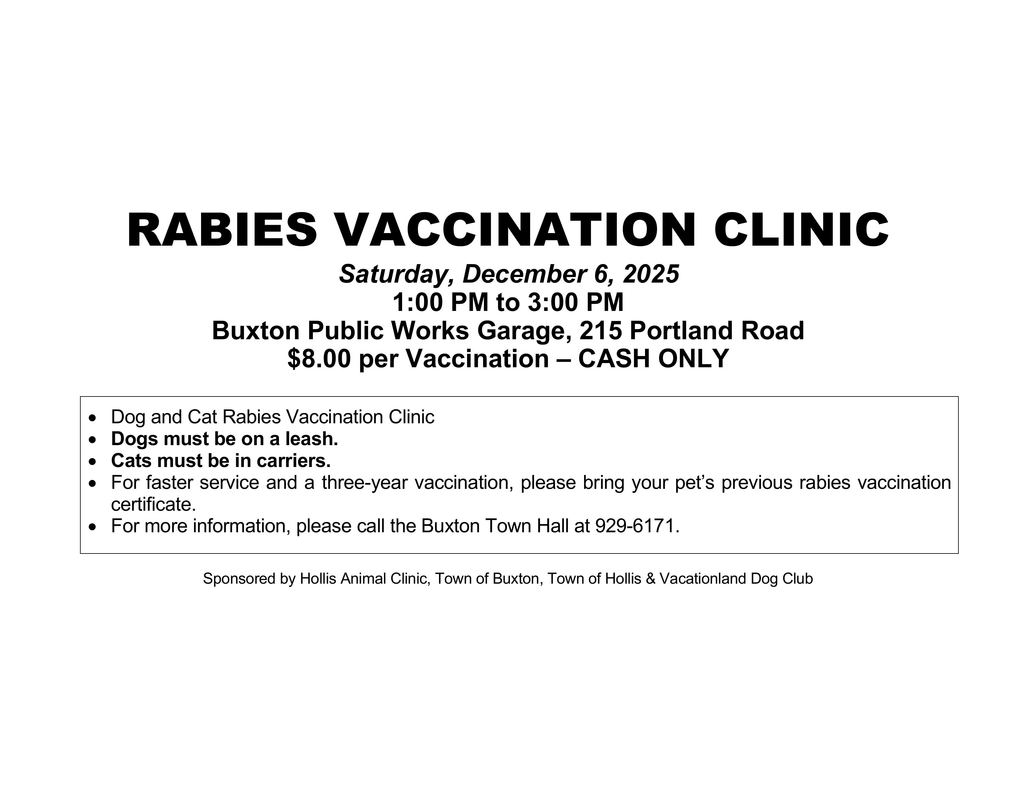 For more information, please call the Buxton Town Hall at 207-929-6171.