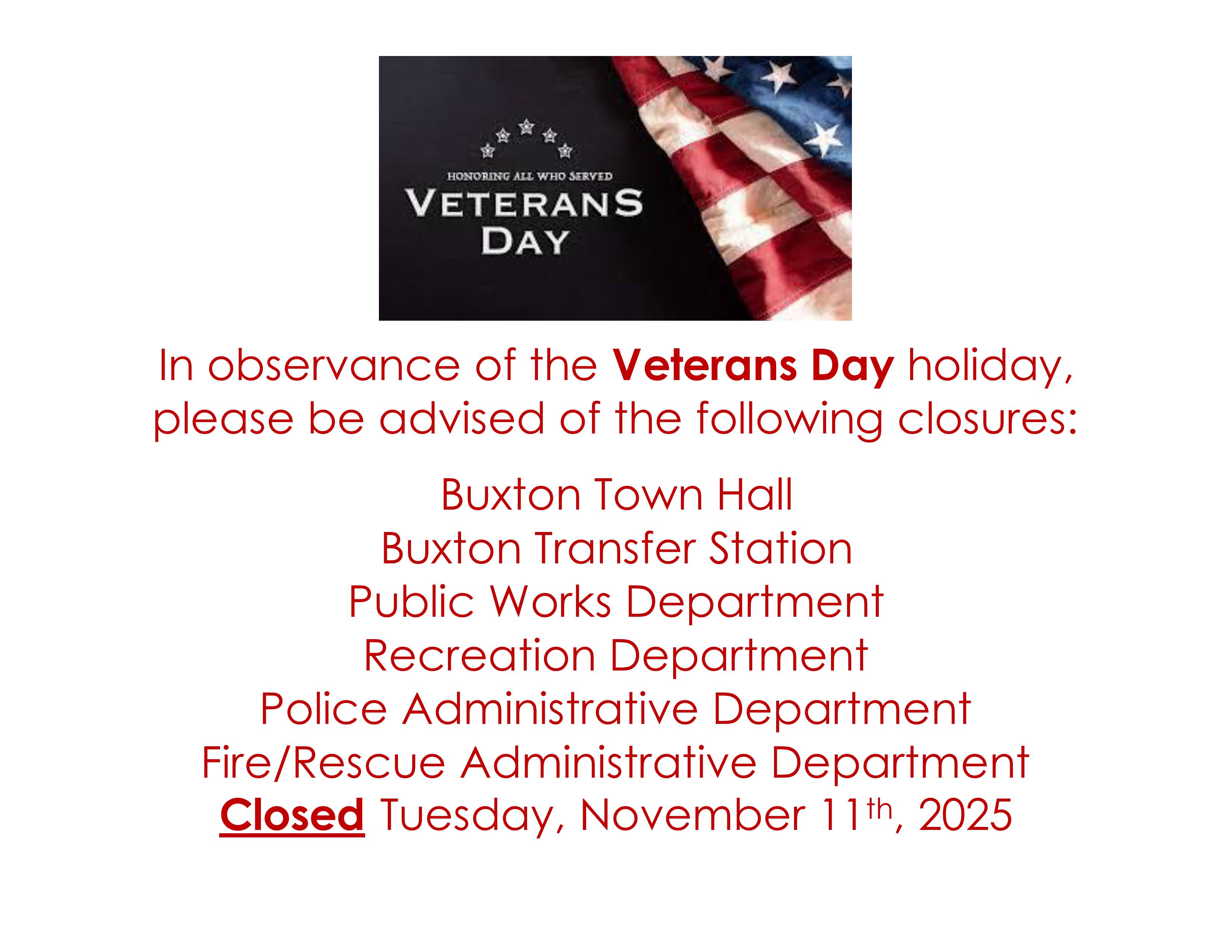 The Buxton Town Hall and the Transfer Station will be closed on Tuesday, November 11th in observance of Veterans Day. There will be no changes to curbside trash pickup.