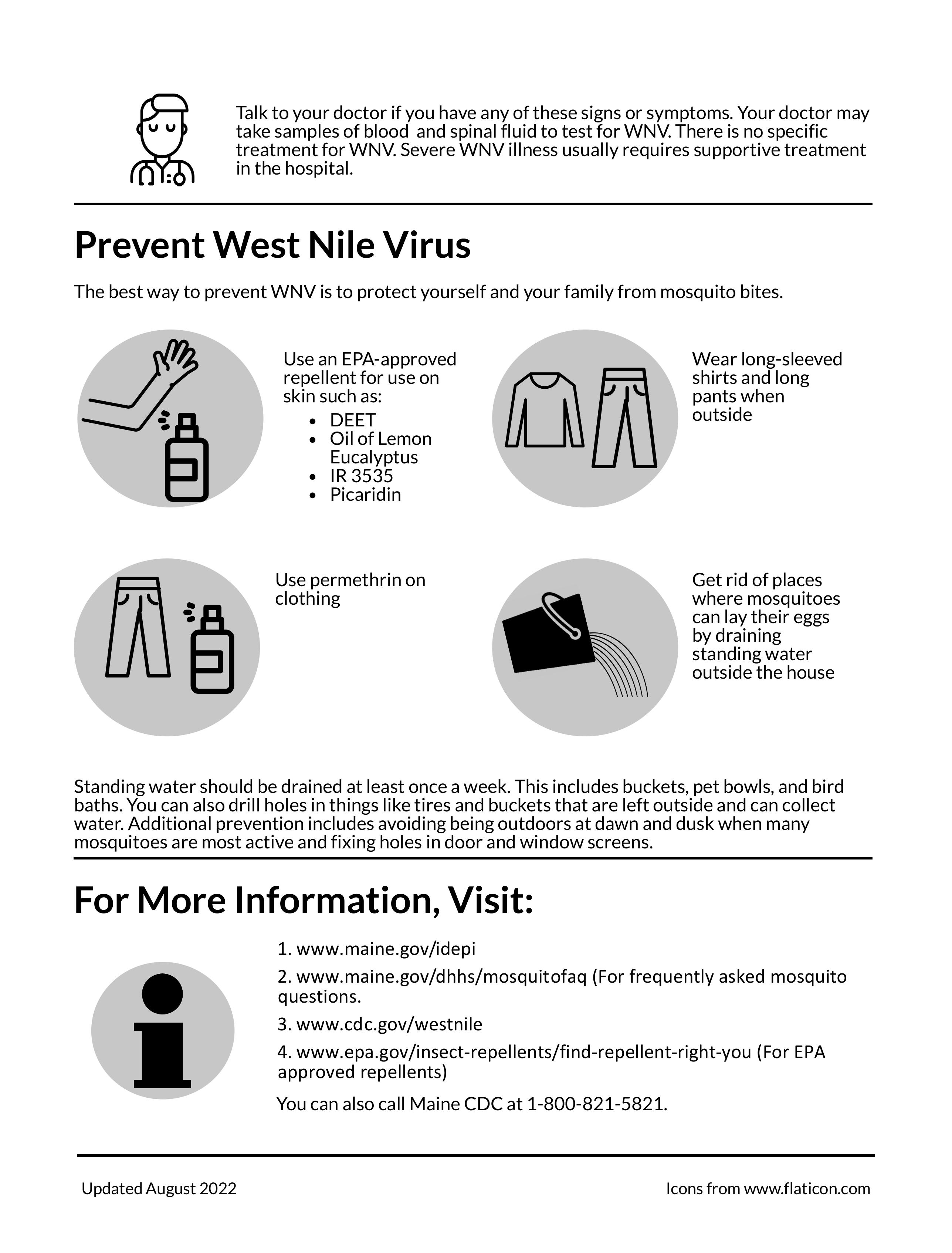 For additional information, please visit the Maine CDC’s website at: https://www.maine.gov/dhhs/mecdc/diseases-conditions/insect-and-animal-borne-diseases/mosquitoes/west-nile